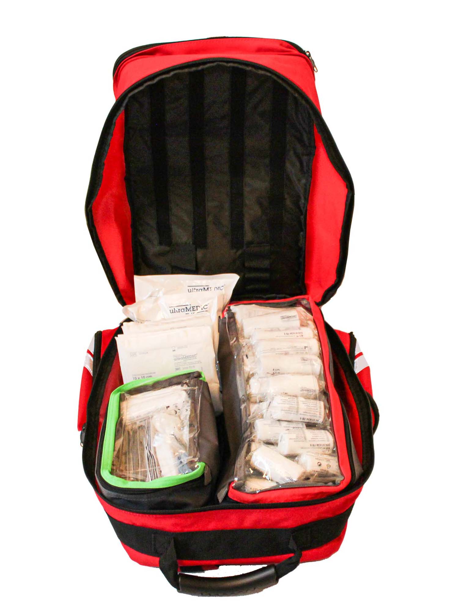 Leichter und kompakter Rettungsrucksack aus strapazierfähigem Corduramaterial. Mit seiner Größe von 45 x 27 x 21 cm (H/B/T) passt der ultraRESCUE LITE in fast jeden Schrank, Kofferraum oder Ablagefach eines Einsatzfahrzeuges. Dank vier Außentaschen und einer Reißverschlußerweiterung von 5 cm kann er dennoch ein umfangreiches Equipment zur Ersten Hilfe aufnehmen und bleibt dabei flexibel im Einsatzbereich. Im Inneren sorgen vier farbig gekennzeichnete Modultaschen für Ordnung und Übersicht. Das im Rettungsdienst seit langem etablierte System aus einer Befestigung der Modultaschen im Bodenfach des Rucksacks mittels Klettsystem ermöglicht ein „Arbeiten wie die Profis“. Die durchsichtigen Deckeltaschen zeigen auf einen Blick die jeweiligen Inhalte. Die Füllung "Erste Hilfe" enthält alles, was für eine erweiterte Erstversorgung am Unfallort erforderlich ist.
