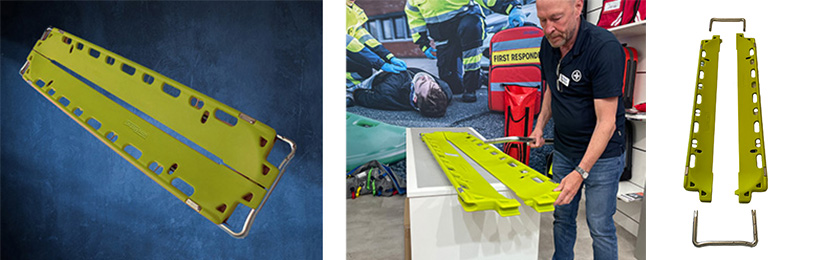 Die beidseitigen Bügelverschlüsse und die extrem flache Schaufelkante ermöglichen ein einfaches und schnelles Aufklappen und Arretieren der beiden Schaufelhälften ohne zusätzliche Korrekturen beim Umlagern des Patienten, auch auf unebenem Untergrund. Die konkave Form des ultraCOMBI-STRETCHER II gewährleistet eine vollständige Immobilisation und ermöglicht einen einfachen, sicheren und patientenschonenden Transport.