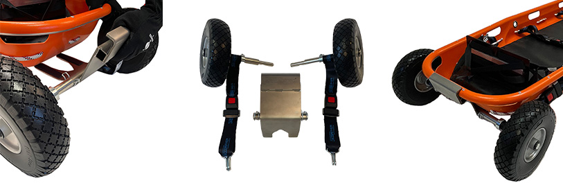 Das Fahrgestell besteht aus einer Basisplatte aus Edelstahl sowie 2 Steckachsen mit Rädern und integriertem Gurtsystem. Die Basisplatte kann schnell vormontiert und bei Bedarf durch Einhängen und Arretieren der Gurte an der Korbtrage befestigt werden.