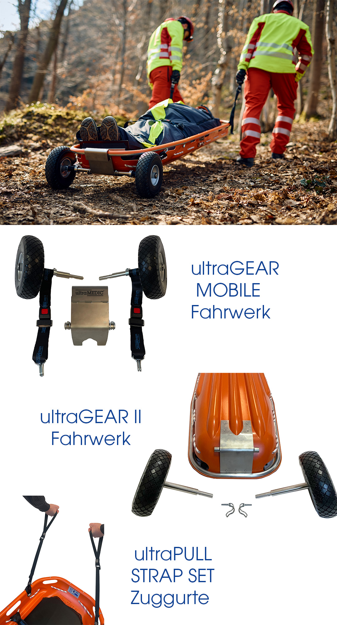 Der Fokus bei der Entwicklung lag klar auf Nachrüstbarkeit und platzsparender Verstaubarkeit im Einsatzfahrzeug. Die Variante ultraGEAR II bietet eine fest installierte Basisplatte mit abnehmbaren Steckachsen. Die mobile Variante ultraGEAR MOBILE hingegen kann flexibel an verschiedene Korbtragen-Modelle angebracht werden – ganz ohne feste Montage.