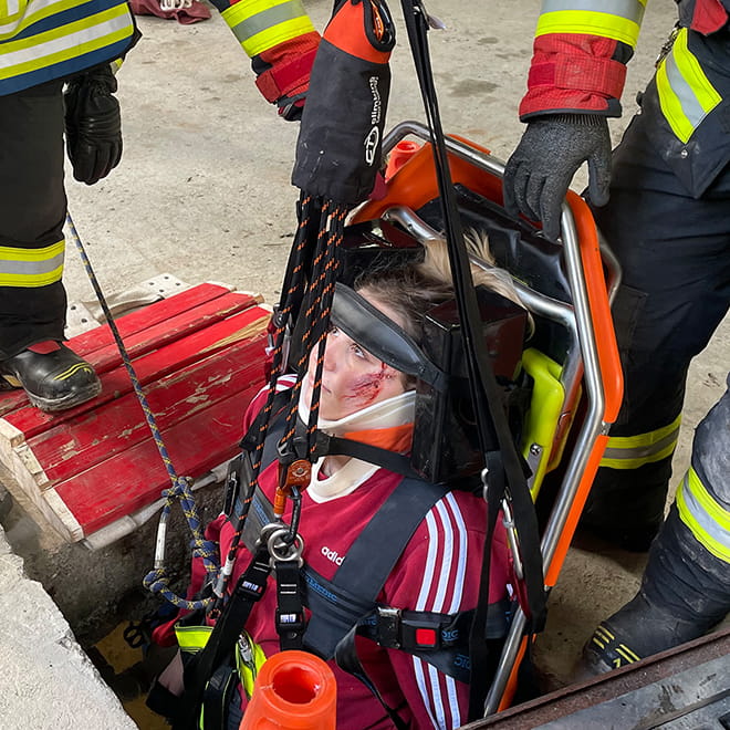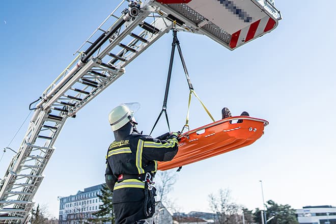 Für die Feuerwehr, die täglich unter extremen Bedingungen arbeitet, sind die Schleifkorbtragen von ultraMEDIC nicht nur Ausrüstung, sondern ein verlässlicher Partner im Einsatz. Die robuste Konstruktion aus ASA/ABS und Aluminium gewährleistet Langlebigkeit und Widerstandsfähigkeit gegen Hitze, Feuer und chemische Substanzen. Dieser Schutz ist essentiell in der Brandbekämpfung und bei technischen Hilfeleistungen. Dank ihrer Vielseitigkeit lassen sich unsere Korbtragen sowohl horizontal als auch für die Vertikalrettung einsetzen, was sie ideal für Rettungseinsätze in komplexen und schwer zugänglichen Umgebungen macht. Die intuitive Bedienbarkeit und die schnelle Einsatzbereitschaft unserer Schleifkorbtragen ermöglichen es Feuerwehrteams, effizient und sicher zu arbeiten. Ob bei der Rettung aus brennenden Gebäuden, aus Höhen oder Tiefen oder sogar der Eisrettung. Die stoßdämpfende Matratze und die verstellbare Fußstütze sorgt für den Schutz und Komfort des Geretteten. Zusätzlich erleichtern die integrierten, metallverstärkten Ringe zum Einhaken von Karabinern das Abseilen und den Transport von Patienten.