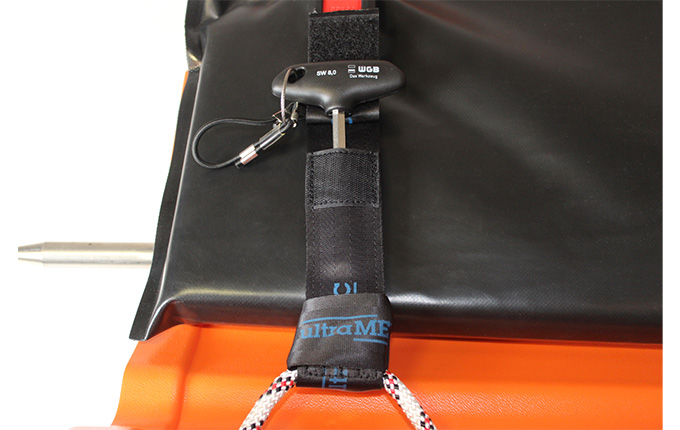 The basket stretcher has 4 attachment points for abseiling or transport slings, recognisable by a round metal eyelet on the sides. Due to the load distribution when transporting a patient, these are not arranged symmetrically. Any slings may only be attached to these eyelets and not to the recessed grips or other points.