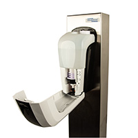 Der ultraTOWER I ist ein berührungsloser Desinfektionsmittelspender, montiert auf einem extrem stabilem und standfesten pulverbeschichteten Matellständer. Das Befestigungsmaterial ist im Lieferumfang enthalten. Der Spender enthält einen Nachfüllbehälter mit einem Volumen von 500 ml, in den das Desinfektionsmittel eingefüllt wird und verfügt über eine Auffangschale, die ebenfalls am Metallständer montiert wird. Er wird mit vier Batterien vom Typ C LR14 1,5 V betrieben, welche im Lieferumfang enthalten sind. Die Abgabe erfolgt wahlweise in Sprüh- oder Tropfenform. So ist gewährleistet, dass die für die wirksame Handdesinfektion empfohlene Menge von 3 ml pro Abgabe erreicht werden kann. Die Abgabemenge kann in vier Stufen eingestellt werden. Eine LED signalisiert die Funktionsbereitschaft des Spemnders.