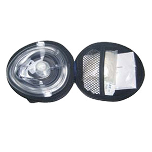 Beatmungsmaske mit Sauerstoffanschluss, integrierter, austauschbarer Bakterienfilter und Einwegventil, 2 alkoholische Pads, 2 Einweghandschuhe Lieferung in Kunststoff-Box mit praktischer Trageschlaufe.